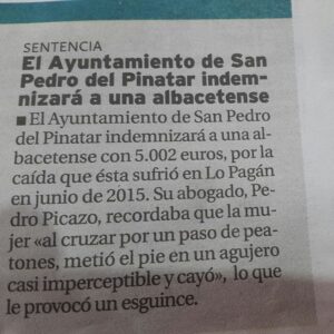 Una sentencia dictada en un procedimiento representado por el abogado Pedro Picazo, director de Bufete Picazo, ha declarado la responsabilidad patrimonial del Ayuntamiento de San Pedro del Pinatar y lo condena a indemnizar a una vecina de Albacete por una caída sufrida en la vía pública, en la localidad de Lo pagan (Murcia).