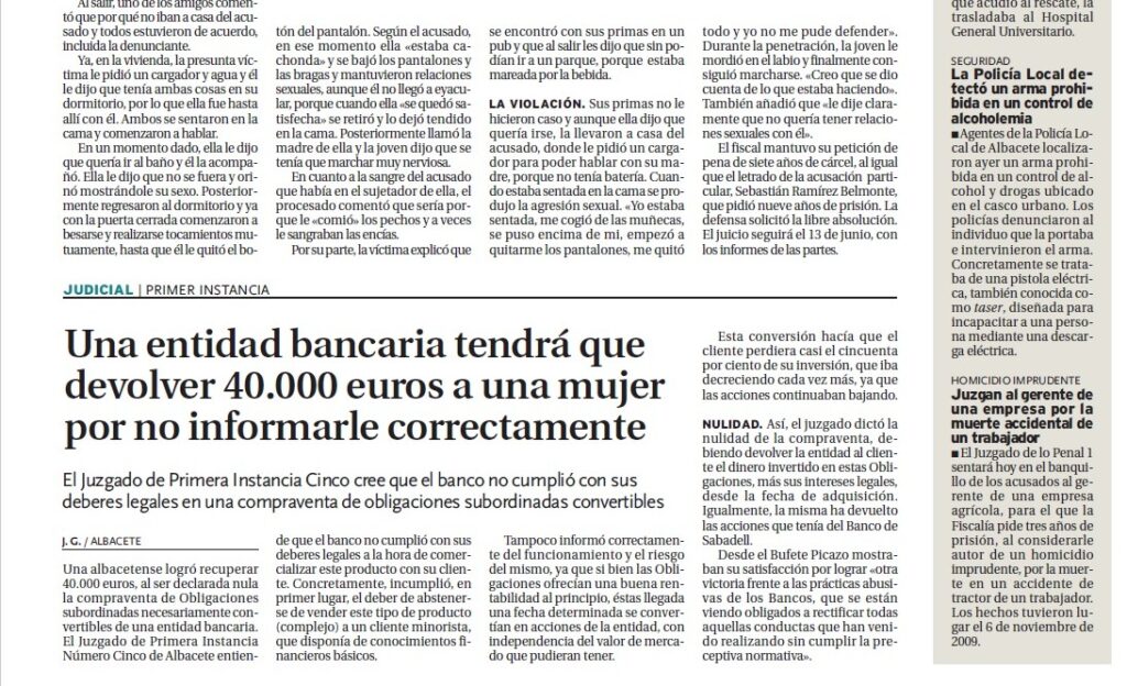 El Juzgado de Primera Instancia Nº 5 de Albacete ha declarado la nulidad del contrato de compra de valores de las Obligaciones subordinadas convertibles vendidas por el Banco Sabadell a una vecina de Albacete y condena a la entidad a devolver la cantidad invertida más el interés legal desde la fecha de adquisición. La sentencia […]